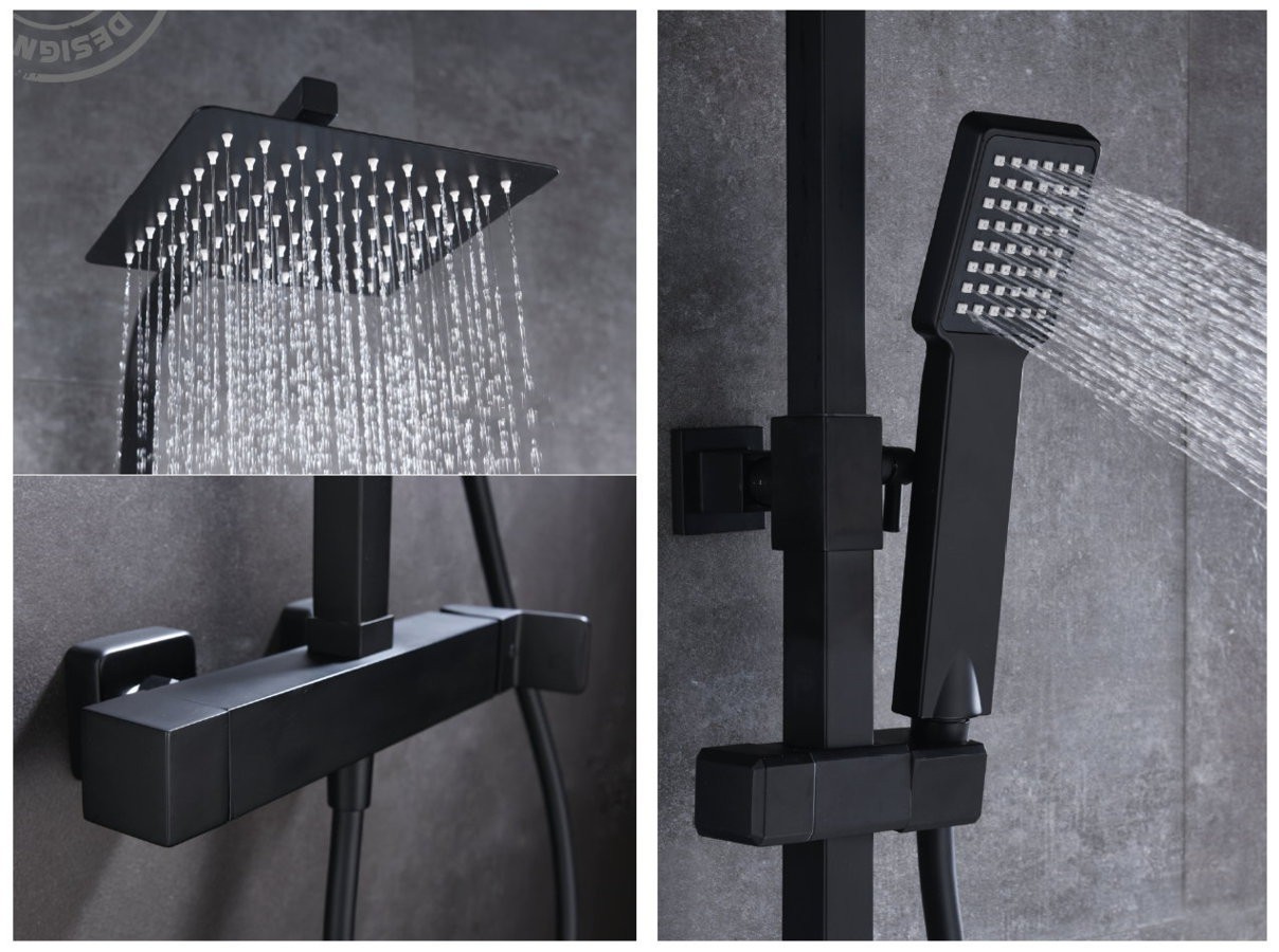 Rociador de acero inox. cuadrado 20cm, extraplano, negro mate y antical.
