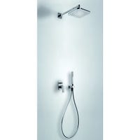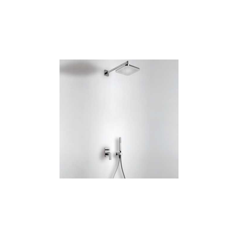 · Cuerpo empotrado incluido.· Inversor de 2 vías.· Brazo a pared con rociador de ducha orientable: 220×220 mm.· Soporte para ducha de mano con toma de agua a pared.· Ducha de mano anticalcárea.· Flexo satinado.